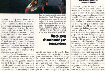 … Un coup d’œil à Jean-Luc, un des deux CRS secouristes : « Allez, tu y vas ! » Gérard Mathieu, le mécano met le treuil en marche. Brusquement l’hélico plonge et part vers la paroi, comma aspiré par le vide. Réaction du pilote au centième de seconde, à croire qu’il a senti le coup venir. Jean-Luc au bout du câble, frôle le mur. Chacun a imaginé la catastrophe. Avec cette aérologie pourrie, un autre essai serait suicidaire. Alain Franjou dépose Jean-Luc et son coéquipier André sur l’arrête sommital. « Préparez un emplacement pour le Poma, je vais le chercher et je vous ramène du renfort. » … |