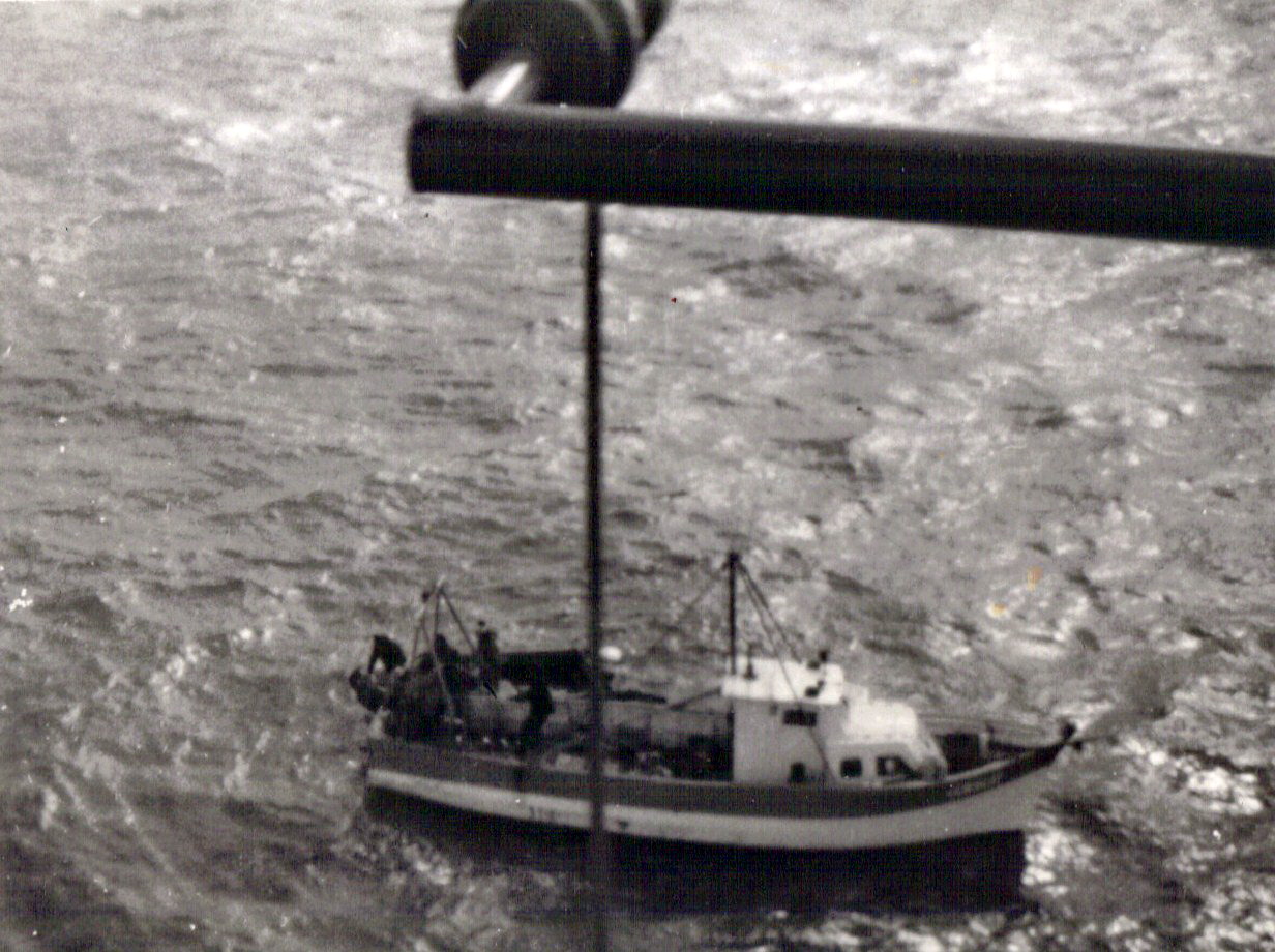 Risquant à plusieurs reprises de basculer par-dessus bord, je parviens finalement à me saisir de la sangle de sauvetage. À peine attaché, je me retrouve extirpé du canot obligé de relever les jambes pour ne pas goûter à l’eau glacée et remonter enfin vers l’hélico. Arrivé à hauteur de la cabine, j’ai bien cru passer la tête à travers le fuselage et en voyant l’embarras du treuilliste, j’ai préféré remettre à plus tard ma désapprobation, surveillant de plus prêt la récupération de mon collègue. Le canot est abandonné sur place et nous rentrons sur Granville. Ce treuilliste improvisé, en chemise blanche et cravate noire n’était en fait, pas du tout préparé à ce genre d’exercice et n’avait jamais effectué une telle manœuvre.
