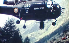 Démonstration de l’Alouette 3 F-MJBG dans le Briançonnais avec hélitreuillage chaise BARREL (du nom de son concepteur le maréchal des logis-chef Aimé Barrel) durant l’été 1973.