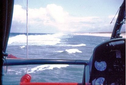 Évoluant en permanence sur les plages, les chaussures pleines de sable, parfois je décidais de travailler pieds nus, y compris en vol. Le bas de la combinaison remonté sur les mollets, cela me donnait une allure inhabituelle mais ô combien pratique et efficace. Il n’était pas toujours évident d’enchaîner les hélitreuillages, l’assistance médicale, le transport du matériel et à l’occasion, les fonctions d’agent des pompes funèbres, dans le sable, sous un soleil de plomb.