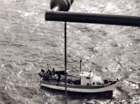 Risquant à plusieurs reprises de basculer par-dessus bord, je parviens finalement à me saisir de la sangle de sauvetage. À peine attaché, je me retrouve extirpé du canot obligé de relever les jambes pour ne pas goûter à l’eau glacée et remonter enfin vers l’hélico. Arrivé à hauteur de la cabine, j’ai bien cru passer la tête à travers le fuselage et en voyant l’embarras du treuilliste, j’ai préféré remettre à plus tard ma désapprobation, surveillant de plus prêt la récupération de mon collègue. Le canot est abandonné sur place et nous rentrons sur Granville. Ce treuilliste improvisé, en chemise blanche et cravate noire n’était en fait, pas du tout préparé à ce genre d’exercice et n’avait jamais effectué une telle manœuvre.